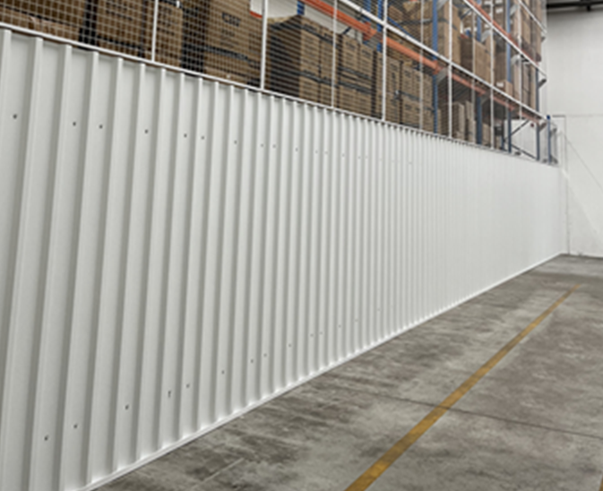 Paletový regál doplněný zadní ochrannou sítí a trapérovým plotem pro oddělení uživatelů haly.